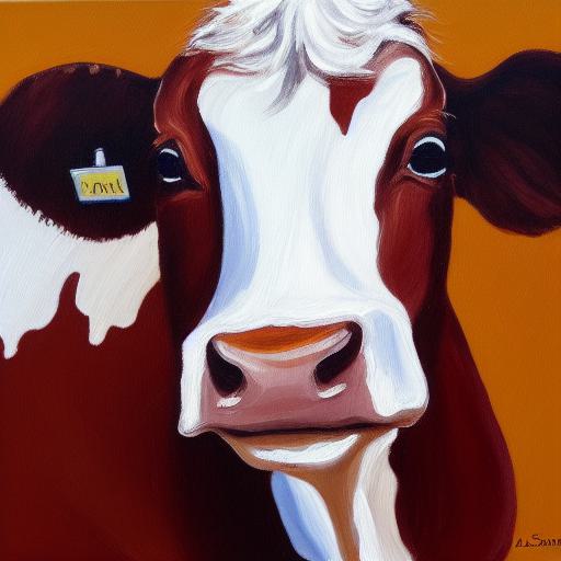 A painting of a brown and white cow