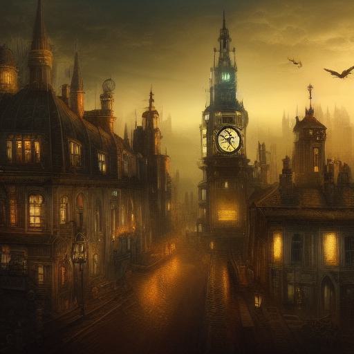 Lastly, the mention of a “steampunk city” sets the genre and style, invoking a fusion of retro-futuristic technology, intricate gears, and Victorian-inspired designs. It prompts the AI to create a cityscape that captures the essence of this popular subgenre.