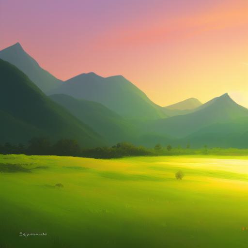 A painting of a green field with mountains in the sunset background