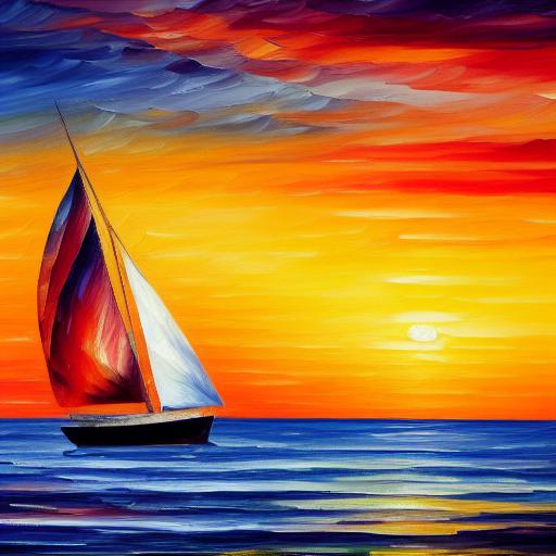 A painting of a sailboat at sunset with the sea