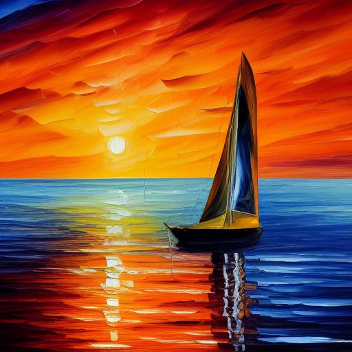 A painting of a sailboat with orange sunset in the sea