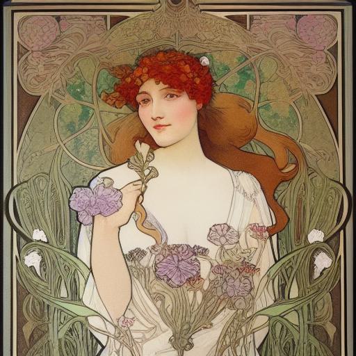 Overall, the prompt for this AI image aims to create an art nouveau-inspired painting of a woman holding flowers, with a focus on the style of Alphonse Mucha and the raphaelite movement. The use of specific keywords and references in the prompt provides the AI with direction and inspiration for the creation of a unique and artistic image.