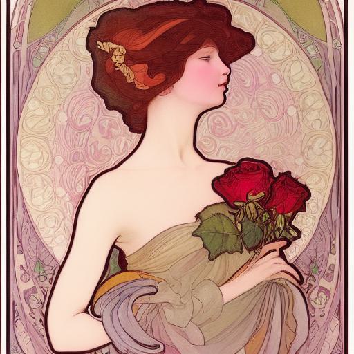 Here is a captivating painting that depicts a woman delicately holding a rose. This exquisite artwork takes inspiration from the art nouveau movement and the influential works of Alphonse Mucha, blending elements of art nouveau, raphaelite, and the distinct style of Mucha himself. Let us delve into the intricacies of this evocative prompt and explore its profound impact on the final image.