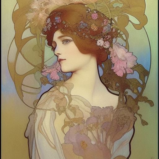 - Alphonse Mucha: By specifically mentioning Alphonse Mucha, the prompt highlights his influential role in shaping the art nouveau style. His distinct artistic vision often featured elegant women adorned with nature-inspired elements, creating a harmonious blend of human form and organic shapes.
