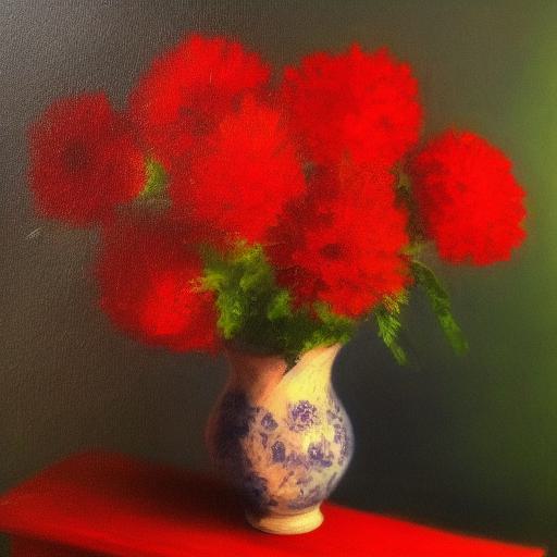 Firstly, the prompt specifies that the image should be a painting of beautiful red flowers in a vase on a table. This gives the algorithm a clear subject to focus on and creates a specific image in the mind of the viewer. The choice of red flowers and a vase gives the image a vibrant and lively feel, while placing them on a table grounds the image and creates a sense of realism.