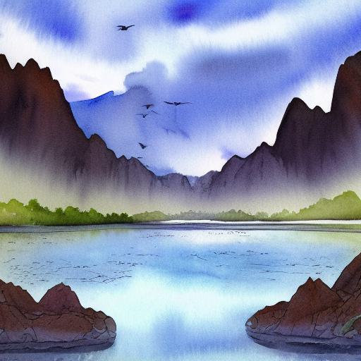 A serene detailed watercolor painting of a river with a mountain and rocks in the background with many birds in the sky