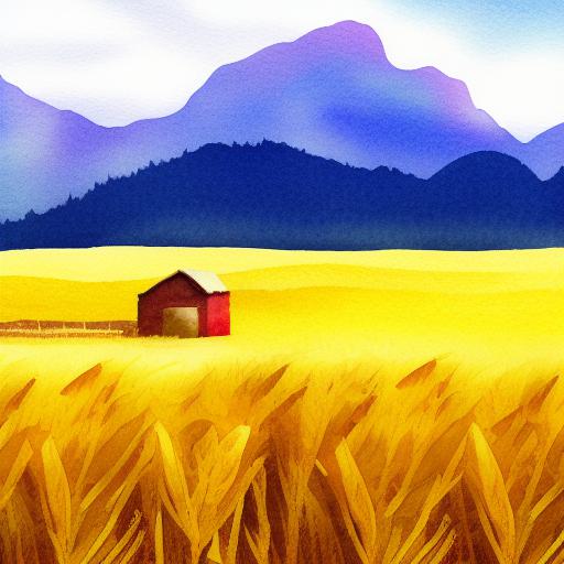 A watercolor painting of a field of wheat and farmer with a mountain in the background