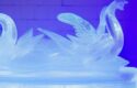 An tranquil ice sculpture of two glowing ice-made swans on a wave