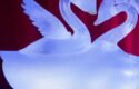 An tranquil ice sculpture of two glowing ice-made swans on a wave