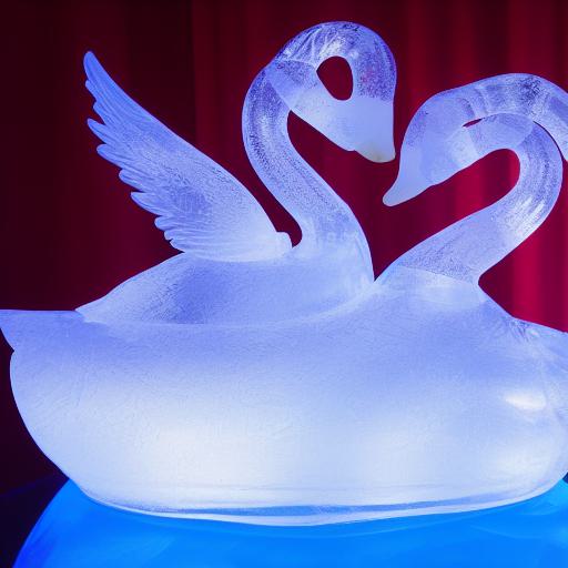 An tranquil ice sculpture of two glowing ice-made swans on a wave