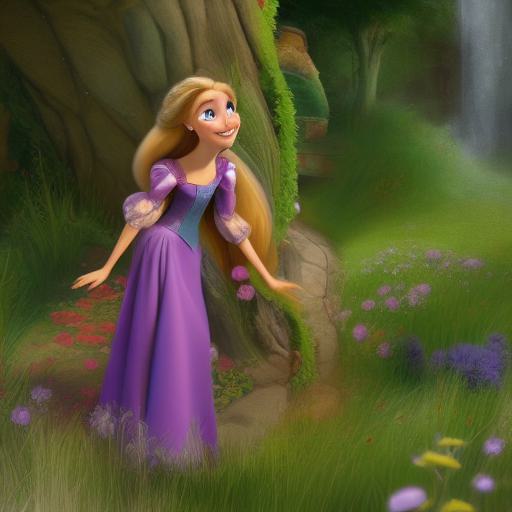 - “Rapunzel” and “Tangled” are specific character and story references that can influence the overall texture and aesthetic of the image. They provide inspiration for the use of specific motifs and themes, such as hair, flowers, and castles.