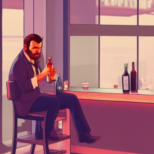 The art style of GTA V, which is known for its photorealistic graphics and detailed environments, likely inspired the prompt to feature a realistic portrayal of a man drinking in a bar. The prompt may also have drawn inspiration from the gritty, urban tone of GTA V’s art style, which is reflected in the weeping man and the bar setting.
