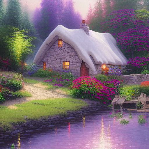 One painting of a cottage by a river with flowers