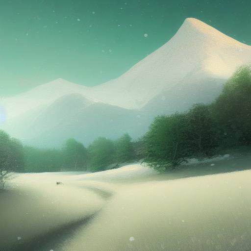 Snowing day with dim sunlight a painting of a green field with snow mountains in the background