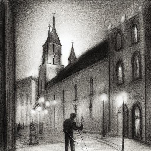 A black and white drawing of a city and church at night with starry sky