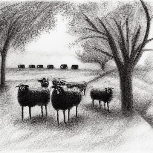 A black and white drawing of sheep in front of the barn with trees