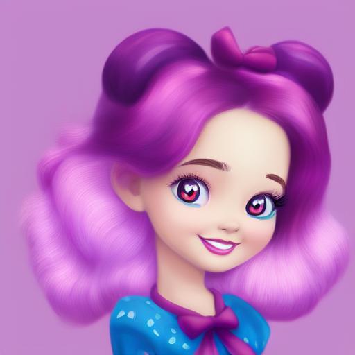 A cartoon girl with purple hair and a red bow in her hair