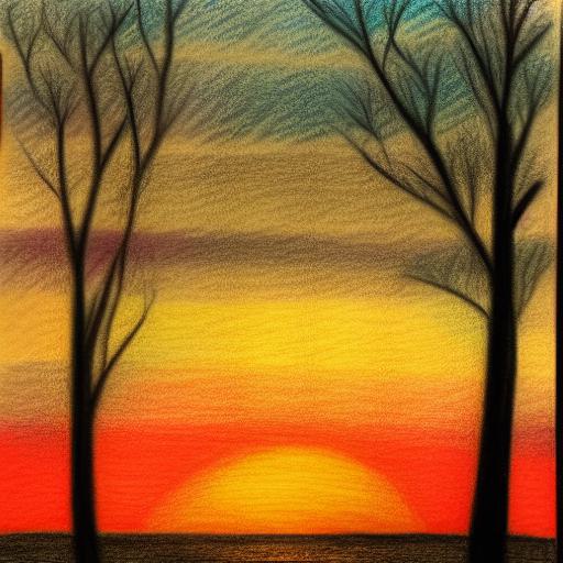 This AI image prompt consists of several parts that influence the image being generated. The first part is the description of the image itself – a drawing of a sunset with a tree. This provides the general subject matter for the AI to work with. The use of color pencil and pastel art techniques adds further detail to the prompt, allowing the AI to create an image with a specific texture and visual style.