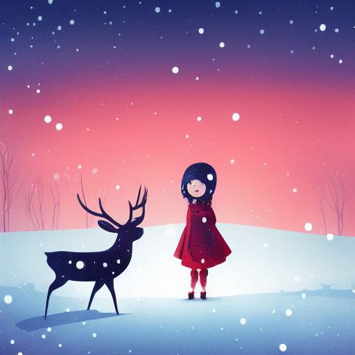 Firstly, the prompt starts with a description of the main elements of the image, which are “a happy little girl with red hood facing backward standing next to a deer in the snow at evening.” This provides a visual scene for the AI to generate. The mention of a “storybook illustration” and “serial art” gives an idea of the style and context of the image.