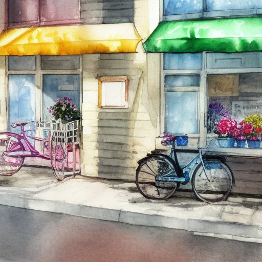 A painting of a bicycle parking in front of a flower shop