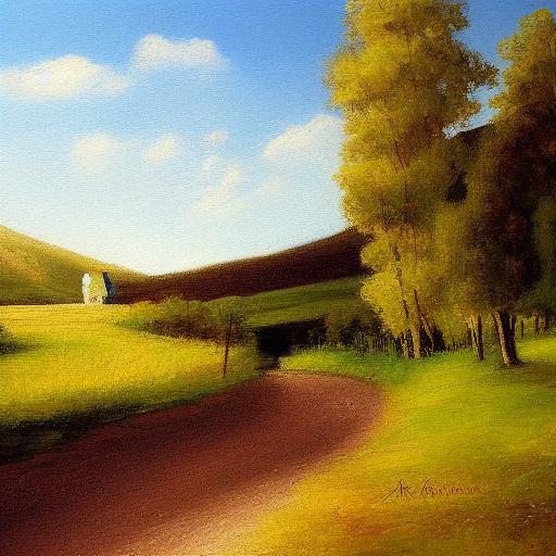 A painting of a country road with a river nearby