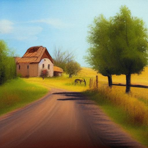 Firstly, the prompt specifies that the image is a painting of a country road with some wooden chairs. This is a very specific visual image that sets the tone for the rest of the prompt. The country road and wooden chairs add a sense of rustic charm and tranquility to the image, while also providing a clear subject for the painting.