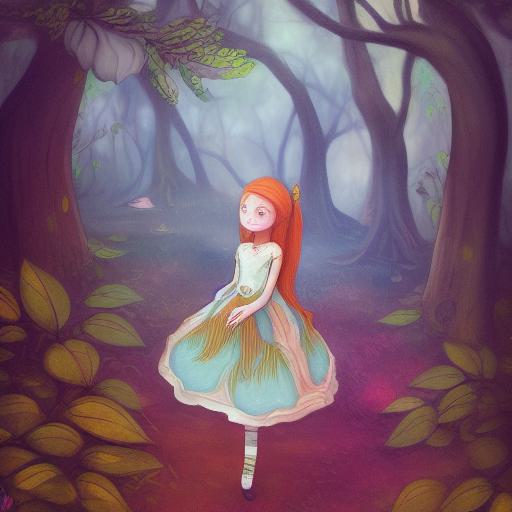 A painting of a girl standing in forest