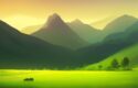 About A painting of a green field with mountains in the background at nighttime