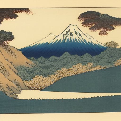 A painting of a mountain and a body of water