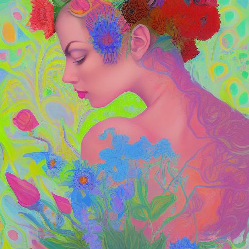 The first part of the prompt, “a painting of a woman with beautiful flowers surrounded,” sets the main subject and theme of the image. This indicates that the image should feature a woman and flowers as the primary focal point. The use of the adjective “beautiful” implies that the flowers should be visually striking and aesthetically pleasing.