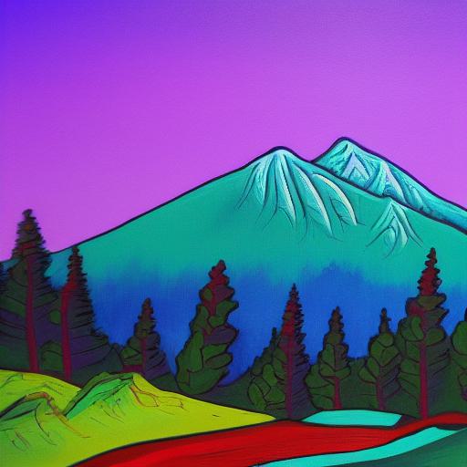 A painting of mountain and trees with a sky