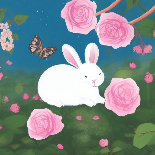 A white rabbit sleeping in the middle of a forest with roses and butterfly