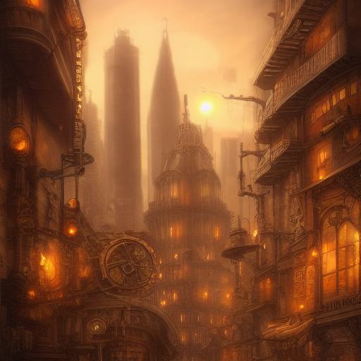 • Golden steampunk city atmosphere: The mention of a golden atmosphere sets a warm and radiant tone. It implies a city bathed in the glow of sunset, casting a golden hue over the buildings and creating a visually striking ambiance.