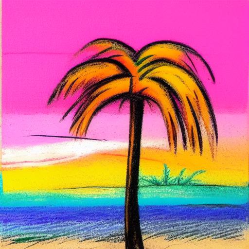 The color painting of a palm tree on a beach