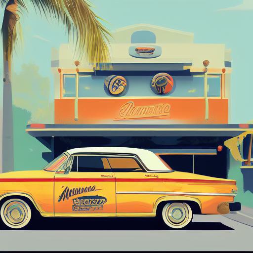 The retro car is parked in front of restaurant