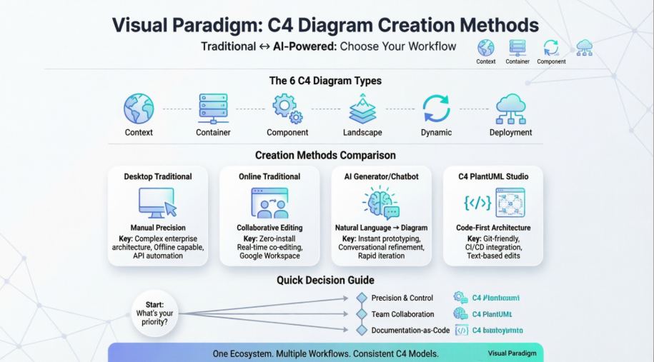After extensive hands-on evaluation, Visual Paradigm’s multi-method approach to C4 diagram creation stands out for its adaptability rather than any single “best” feature. No tool perfectly serves every context—but by offering traditional manual modeling, AI-assisted generation, code-first PlantUML integration, and programmatic automation within a cohesive ecosystem, Visual Paradigm acknowledges that architecture documentation is not a one-size-fits-all challenge.