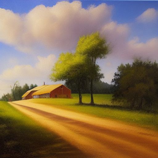 A painting of a country road and farmers