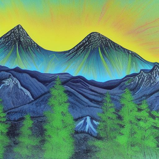 A painting of a forest and mountain