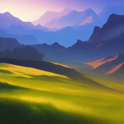 A painting of a green field with mountains in the sunset background