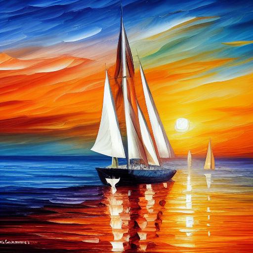 A painting of a sailboat at sunset in the middle of the sea