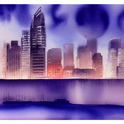 A painting of a view of a city and buildings at night with sky