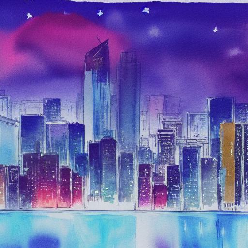 A watercolor painting of a view of a cityscape and buildings with night sky