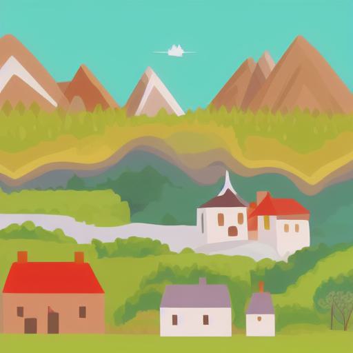 An illustration of a village with mountains and trees