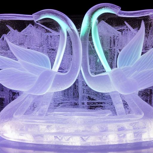 An tranquil ice sculpture of two glowing ice-made swans on a wave