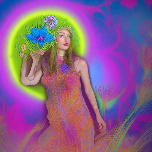 - The rainbow-colored dress adds to the overall psychedelic theme of the image.