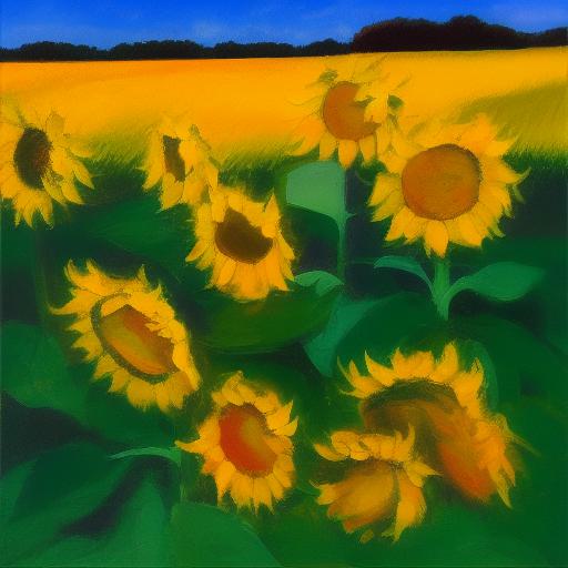 The oil painting of sunflowers in the field