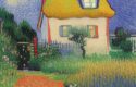 About A color painting of the house in a garden