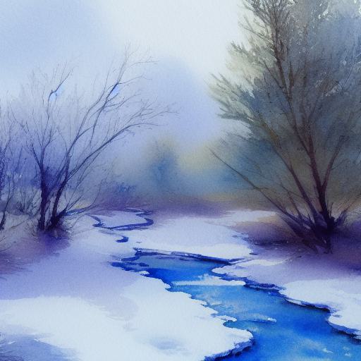 A light watercolor painting of snow-covered trees and a stream