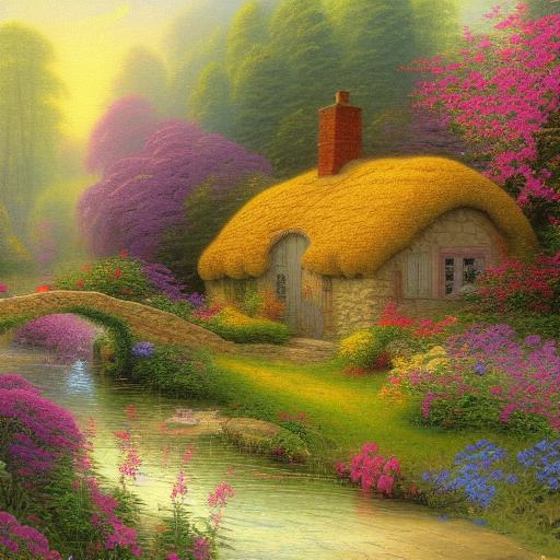 A painting of a cottage near a river with many flowers