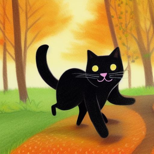 A painting of a giant black cat running in the autumn forest